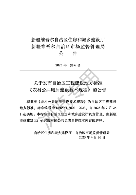 关于发布自治区工程建设地方标准《农村公共厕所建设技术规范》的公告