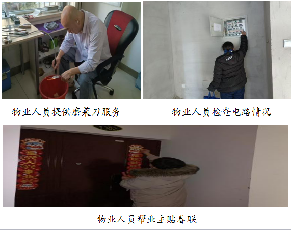 2.构建“全周期”服务链条,覆盖多元生活场景。 小区围绕日常居住保障与特殊需求响应,建立全场景、无死角服务体系。一是定期开展入户门除尘专项行动,在春节、中秋节等传统节日期间,为业主提供入户门擦洗、对联张贴等便民服务;二是推出免费磨菜刀、代购天然气、代寄快递等便民举措,由管家上门收取菜刀并进行封存标记,确保24小时内完成维修并送回;三是针对空置房业主,提供每月免费开窗通风、水电安全检查服务,并通过视频实时反馈,建立“远程管家”服务机制。该系列“主动服务、提前预判”的全周期服务模式,有效突破了传统物业“被动响应”的局限,显著提升了服务的前瞻性与精准性。