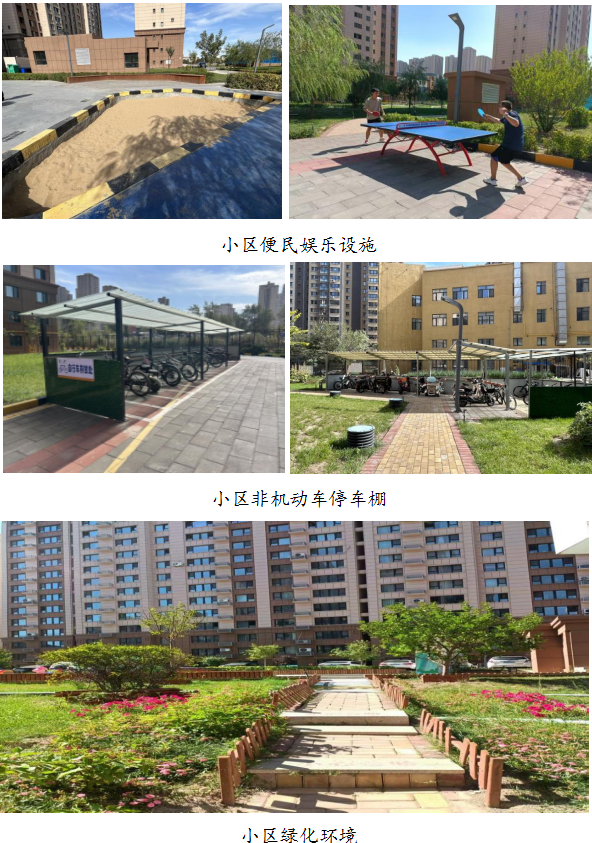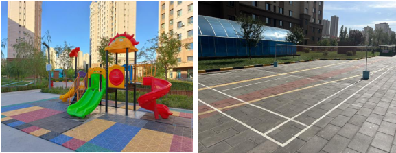 (二)聚焦环境提质,推动园区功能与风貌双升级 良好的居住环境是“美好家园”的核心基础。蓝天芳草地小区以“微改造、精提升”为核心路径,既精准补齐基础设施短板,又精心塑造特色景观风貌,实现“宜居”与“宜游”的有机统一。 1.补齐设施短板,提升居住便利度与安全性。 针对小区原有设施配套不足的问题,蓝天芳草地小区物业精准聚焦薄弱环节,开展设施增补与升级改造工作,全面提升居民生活体验。一是完善儿童游乐设施,在A区小广场新增滑滑梯,在B区增设摇摇椅,同时将原有施工沙坑更换为安全环保的沙漠沙子,为儿童打造安全、趣味的游乐空间;二是补强健身配套,在A、B区小广场新增3张乒乓球桌、4个羽毛球网,安排维修人员每日巡检设施安全性,确保居民健身需求与使用安全;三是规范非机动车管理,专门搭建符合消防规范的标准化充电棚及专属停放区域,精准破解业主“充电难、停放乱”的民生痛点;四是消除安全隐患并美化环境,针对B区广场人行道雨雪天易滑的问题,将其改造为阶梯式通道,同步加装防护围栏与氛围灯,在通道两侧种植草坪花卉,实现安全保障与景观美化的双重提升。