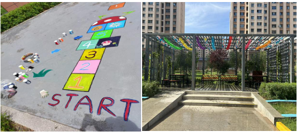 2.塑造特色风貌,增强社区文化认同感。 以“文化赋能、景观造景”为工作主线,小区着力提升文化品质与视觉形象,打造宜居宜乐的人文社区。一是推进公共空间彩绘改造,对小区内灰黑色井盖、墙面、台阶进行创意美化,绘制童趣卡通图案,打造“中华民族一家亲,同心共筑中国梦”主题文化墙,施划儿童跳格子游戏区,让街巷角落焕发新颜。二是盘活闲置资源打造特色景观,用废弃轮胎在A区大门口制作 “出入平安”创意小品,在B区大门口设置“欢迎回家”花卉打卡点,在8号楼前凉亭搭建七彩风车长廊,实现废旧物品的再利用与景观颜值的双提升。三是建设便民文化阵地,在各单元楼一楼大厅设置便民文化墙,集中张贴物业及社区联系方式、邻里和谐宣传海报(含禁止高空抛物、清理楼道杂物等内容),配备儿童身高贴,让公共空间成为传递文明理念、服务居民生活的重要载体。这种“小投入、大效益”的风貌提升方式,既有效控制改造成本,又显著增强了业主的社区归属感与幸福感。