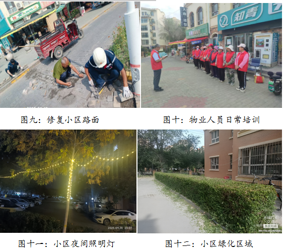 (三)精细整治焕新颜,共建共治谱新篇。亚中玛河生态城小区聚焦环境与基础设施痛点堵点,靶向发力开展全方位集中整治行动,推动人居环境品质提档升级,绘就共建共治共享的治理新图景。一是聚焦环境清洁,焕新居住面貌。全面清理小区165个楼道堆积杂物与卫生死角,精细化开展公共绿地养护工作;同步修复10处长期故障路灯,更换楼栋过道及地下室损坏灯泡200余个,并在B区小广场新增射灯1个,切实做到环境整洁有序、照明充足明亮。二是加强设施投入,完善配套功能。投入3万元专项资金,新增绿化养护设备,改造绿化管阀10个,新铺设绿化灌溉管线2000余米,同步修补B区主道路破损路段,持续夯实小区基础设施硬支撑;额外投入4万余元,新增2个小区大门头标识,助力外来人员快速辨识方位,为居民出行提供实实在在的便利。三是强化共建引导,凝聚治理合力。以规范化治理服务、常态化环境维护为抓手,积极带动居民主动投身小区共建工作,逐步培育“人人关心治理、人人参与治理”的浓厚氛围,携手打造整洁有序、宜居宜业的美好家园。