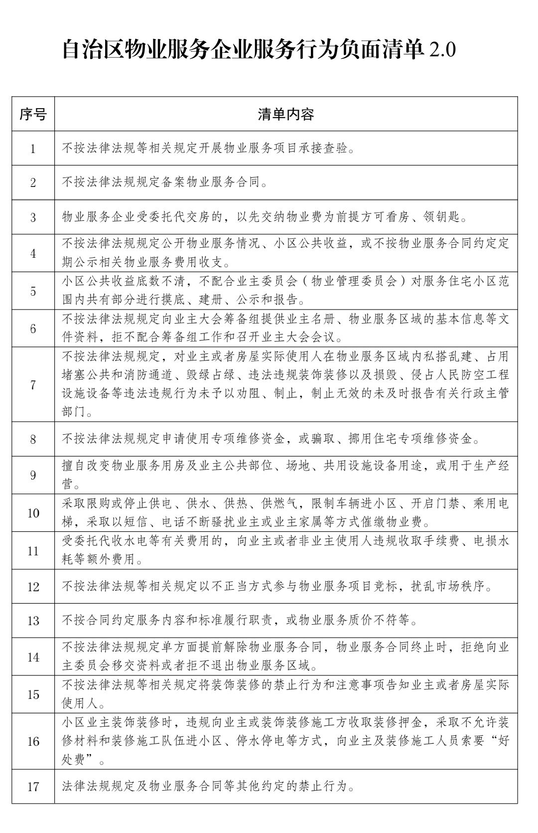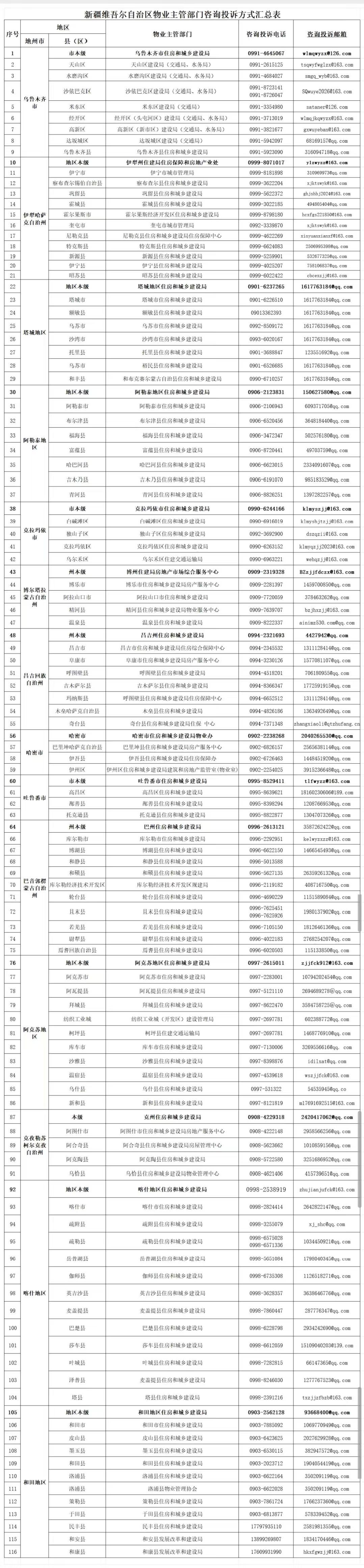 为深入贯彻落实以人民为中心的发展思想,进一步便利群众咨询法律法规政策,畅通物业领域问题诉求渠道,高效推进物业领域诉求办理工作,破切实解决群众在物业管理中遇到的急难愁盼问题,推动物业服务提质增效,提升群众满意度,现向社会公开发布新疆维吾尔自治区物业主管部门咨询投诉电话及邮箱、自治区物业服务企业服务行为负面清单2.0(详见附件1、附件2)。咨询投诉电话及邮箱重点受理群众关于物业管理政策咨询以及以下五个方面的投诉。